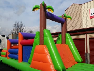 A GIANT Obstacle course ideal for any party or event! To complete this obstacle course you and a friend must run through the twin crawl through tunnels, fight your way through the bish bash section with 5 pillars, get through the up and over squeeze through area, before climbing up the mini steps and finally down the slide! A sure hit to keep both the kids and adults entertained as they compete with their friends to see who can get through first! A very popular obstacle course ideal for indoors or outdoors.